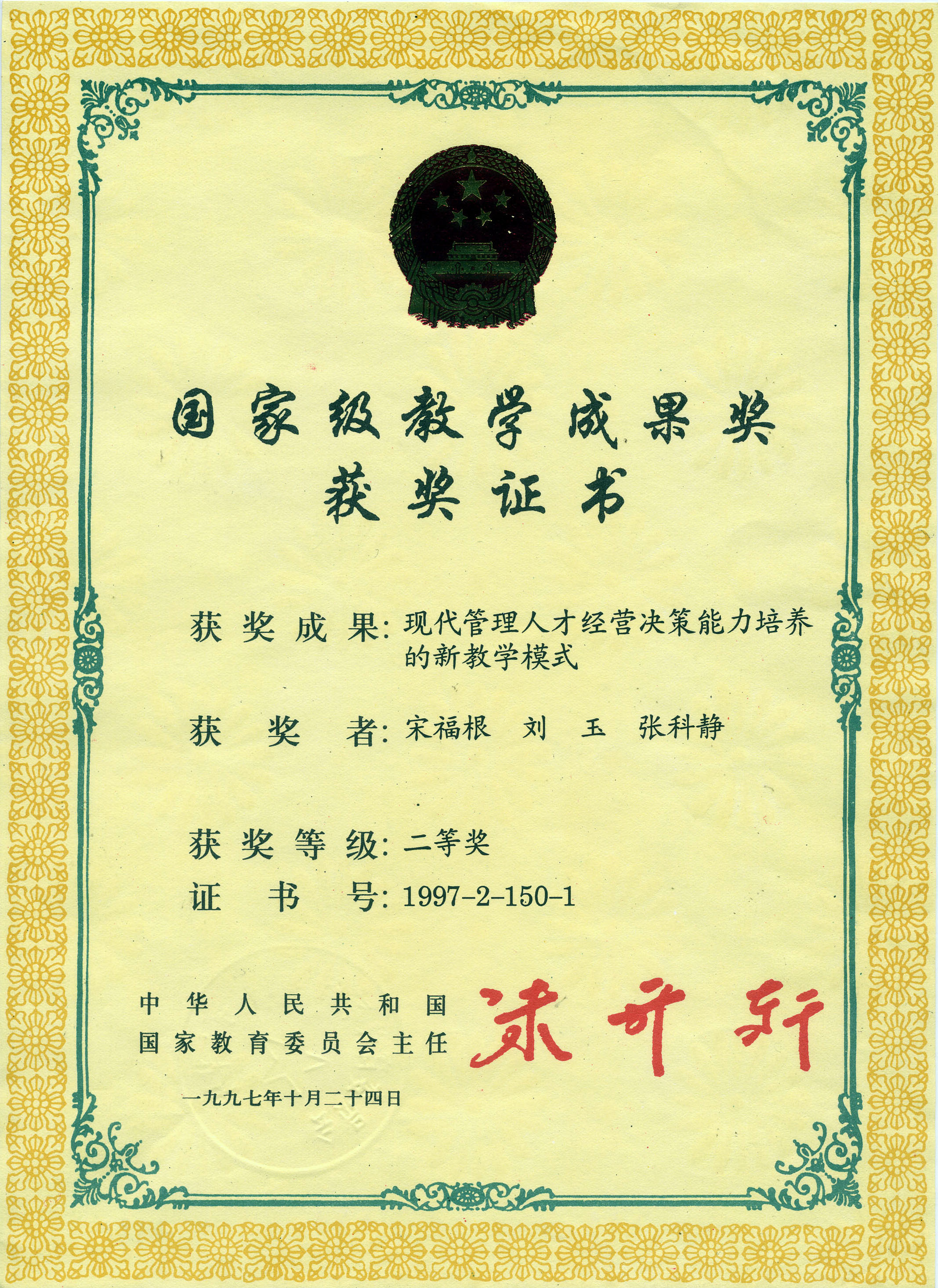 1997年获国家级教学成果二等奖