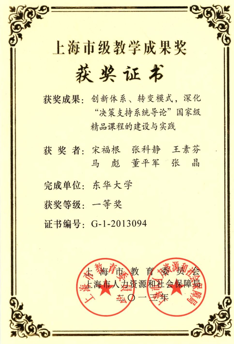 2013年上海市级教学成果一等奖