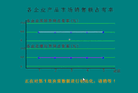 下面的曲线为各企业理论市场占有率,主要由各企业所运用的产品销售价格、广告费用投入、产品质量水平及销售人员数量等四个促销手段强度相比较而得;上面的曲线为各企业实际市场占有率,与各企业理论市场占有率相比,可能会发生一些变化,如当实际市场占有率小于理论市场占有率时,说明企业产品生产量未能及时跟上,所有产品已经全部售完,由于无货可供,一部分原想购买该企业产品的消费者转向了竞争企业,以满足自己的需要;当实际市场占有率大于理论市场占有率时,说明其它企业因无货可供,致使一部分原想购买竞争企业产品的消费者转向了本企业。
