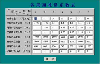 如选中"先行设定难易系数",单击"确定"按钮即可进入"各周期难易系数表"模块,调整七个周期决策仿真的难易程度。