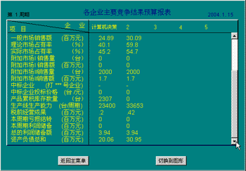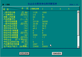 选中"显示周期竞争主要预算数据",单击"确定"按钮后即可进入"各企业主要竞争结果预算报表",查看不同决策方案下各企业产品销售价格、广告费用投入、销售人员数量等促销手段运用数据;产品市场销售量、销售额、市场占有率等市场竞争结果数据;及税前经营成果、周期利润储备、资产负载总和等企业经营状况数据。