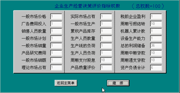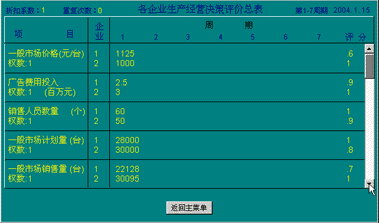 评价总表给出了各企业在不同周期、不同评价指标项上的评分多少。最后给出了评价累计总分和名次。这些数据可供学生评价所作决策方案正确与否分析之用。