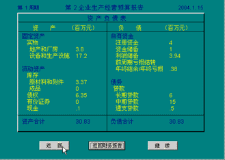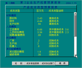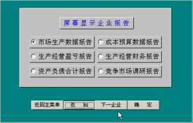 选定主菜单右边第三个选项"显示企业报告",单击"确定"按钮后进入"显示周期企业经营成果报告"和"显示周期企业经营预算报告"选择界面。选中"显示周期企业经营预算报告",进入"屏幕显示企业报告"选择界面。