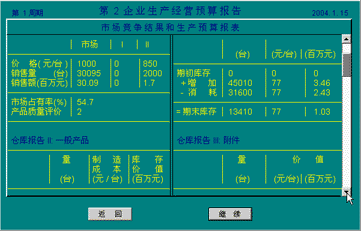 这些报告详细地汇总了企业拟订决策方案下的经营成果数据,如产品市场销售量、销售额、市场占有率、 设备和人员生产能力负荷、 产品生产成本、 产品库存数量、 企业经营盈亏、现金收支流量、企业资产负债和企业财务状况等预算数据,为学生深入分析所作决策方案利弊、进行决策方案调整提供了依据。