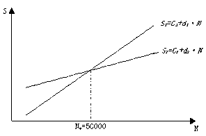 =50000即为这两条直线的交点。 当生产产量N<N0 时,S1<S2 ;当N>N0 时,S1 >S2 。 这表明,当产量N小于N0
