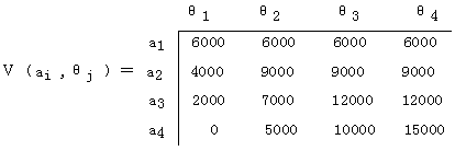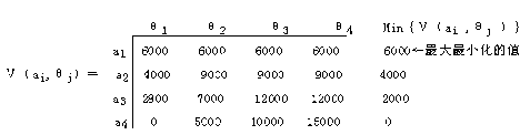 矩阵称为收益矩阵。应用最大最小化准则,各方案在不同状态下的最小收益值Min{V ( ai ,θj)}分别为6000,4000,2000和0,再由Max{Min{V(ai