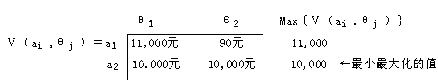 作为决策方案,最大最大化的值为1500元。如果矩阵中的V(ai,θj)表示损失值时, 依据同样的原理,可应用最小最小化准则。