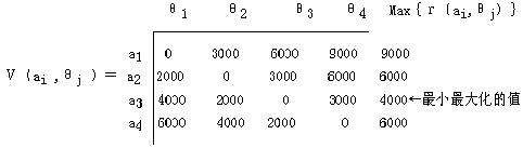 如果矩阵中的V(ai,θj)表示损失值时,则矩阵称为损失矩阵。此时,依据和最大最小化相同的基本思想,可应用最小最大化准则。