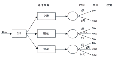 比较各方案的期望值,则应选取陆运方案作为决策方案。如果决策者的风格不一样,估算出的概率值不同,或应用的决策准则不一样,就有可能得出不同的结论。例如,应用的是最大可能性准则的话,则选取的决策方案应是空运方案,而不再是陆运方案。