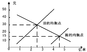 供需均衡点处于稳定状态是相对的、暂时的,而处于不稳定状态则是绝对的、 经常的。因在实际上不可能没有新的干拢因素的影响。只要有新的影响因素出现,需求曲线或供应曲线就会发生位移,原来的均衡状态不复存在,随着供需关系的调整,形成了新的均衡点。例如,某种化纤布由于生产技术水平的提高、成本降低等非价格因素影响而使供应曲线发生位移,供需关系不再平衡,促使价格朝新的均衡点方向变动。最后,当价格由原来的每米30元降到每米15元时,需求量由原来的3亿米增加到4.5亿米,成了新的均衡点。供需关系重新处于相对稳定状态,如图3-3-2 所示。