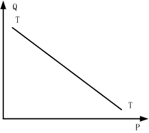 在实际工作中,人们往往采取这样的做法:收集一组不同时间的价格与销售量之间的关系数据,然后根据这些数据来寻找一条与之拟合的曲线作为需求曲线。例如,某企业已知前五年的价格与销售量之间的关系数据,然后根据这些数据作出了与之拟合的需求曲线T──T,如图 3-5-2 所示。