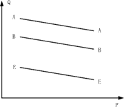 显然,这样求出的需求曲线很可能是不符合实际的需求曲线。实际的需求曲线可能如图3-5-3所示:前第五年中的需求曲线为A-A,前第四年中的需求曲线为B-B,最后一年中的需求曲线为E─E等等。即实际的需求曲线斜率较小(就绝对值来说),随着时间的推移,由于非价格因素也在变化,需求曲线发生了位移。而需求曲线T─T的斜率比实际的需求曲线的斜率要大的多,弹性也要大的多(就绝对值来说)。如果把需求曲线T─T当作实际的供分析用的需求曲线来进行价格决策,就会导致决策上的严重错误。由此可见,需求曲线的拟合必须十分小心,曲线拟合所用的数据必须是同一时间的,而且还应考虑随着时间推移所产生的曲线位移。不然,即使做了大量的运算工作,但得到的结果却可能是根本错误的。