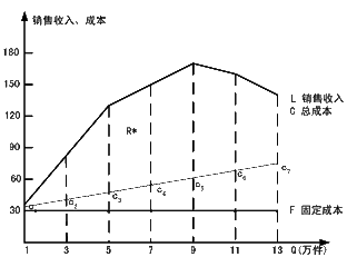 例如,在上例中,根据表3-5-1中所列的价格与销售量之间的关系数对,可以拟合得相应的需求曲线为Q=-0.4P+17,由此而得销售收入函数和总成本函数分别为: