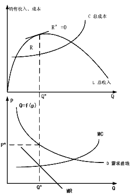 这与式(3-5-1)一致。所以,解得的P* 值也必然相同。再由Q=f(p),即可解得能使L=P×Q达到最大的销售量Q*  ,如图 3-5-4 所示。