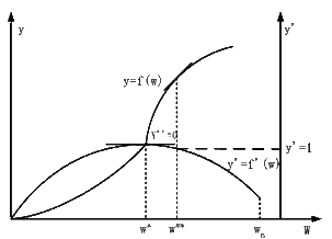 设w为广告费用投入所占销售额的百分比,y为所产生的销售额效应,是由广告费用投入引起的销售额增加量在扣除不包括广告费用在内的成本增加量后所得的销售收益占原销售额的百分比,则销售额效应曲线y=f(w),销售额效应增长率曲线y' =f' (w),如图 3-5-10 所示。