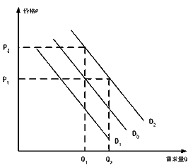 图中,  D0 为广告费用投入未变动前的需求曲线,D1 、D2 为广告费用投入变动后的需求曲线。从图中可以看到,增加广告费用,需求曲线就会从D0 移到D2 , 企业就可以用同样的价格P1 使销售量从Q1 扩大到Q2 ;或销售量不变,使价格从P1 提高到P2 。这样,企业就能从广告中得到好处。