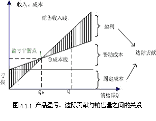 因此,品种边际贡献的实质所反映的就是产品为企业盈利所能作出的贡献大小,只有当产品销售达到一定的数量后,所得品种边际贡献才有可能弥补所发生的固定成本总额,为企业盈利作贡献。产品盈亏、品种边际贡献与产品销售量之间的关系如图4-1-4所示。