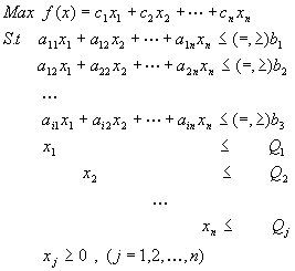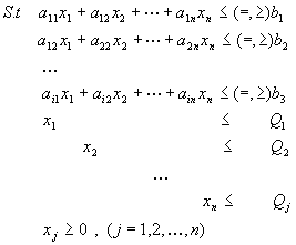 为求取目标函数f(x)最大时给定的各种制约条件。通常分为两大部分: 第一部分属企业内部的各种条件限制,如设备生产能力、人员生产能力、流动资金数量和计划达到的优质产品率、出口创汇率、工业总产值、销售利税率等,各约束条件右端用bi表示; 第二部分属企业外部的限制,主要是市场竞争条件下企业可望达到的产品销售量,在模型中用Qj表示。