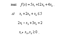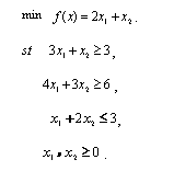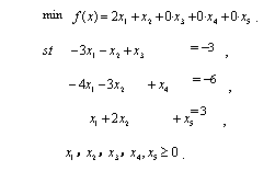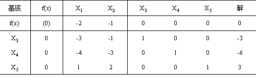 表中,f(x)方程中所有系数都已是非负的,因为是求最小化,  所以,最优性条件已被满足。但这时的初始基本解为x3=-3、x4=-6、x5=3,是不可行的,  因而, 可用对偶单纯形法来求解。
