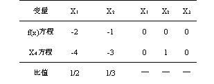 换出变量和换入变量确定后,再用通常的方法进行迭代,得到新的单纯形表。例如,在上述的对偶初始解表中,因为x4=-6是负的最多的基变量,所以,可以被确定为换出变量。f(x)方程左边系数与换出变量x4方程中的对应系数之比为: