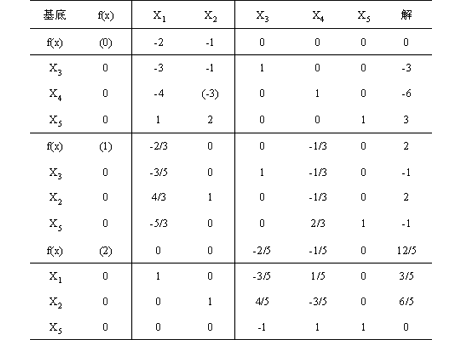 经过两次迭代后,所有的基变量都已是非负的,它们的取值分别为x1*=3/5和x2*=6/5,这时即已取得了最优解,最优值f*(x)=12/5。