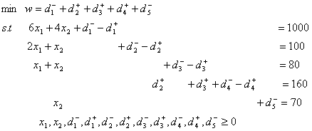 同时把w= 要求有最小值作为新的目标函数, 即要求实际边际贡献低于b1的偏差有最小值,这实际上等价于要求边际贡献有最大值。综上所述,可以得到如下的目标规划模型表达式。
