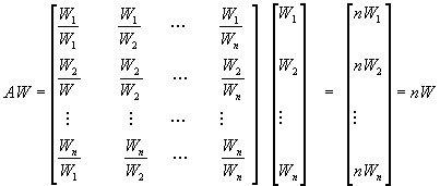 从上式不难看出,以n个物体重量为分量的向量W是判断矩阵的特征向量。根据矩阵理论,n为上述矩阵A的唯一非零的,同时也是最大的特征值, 而W是该特征值所对应的特征向量。