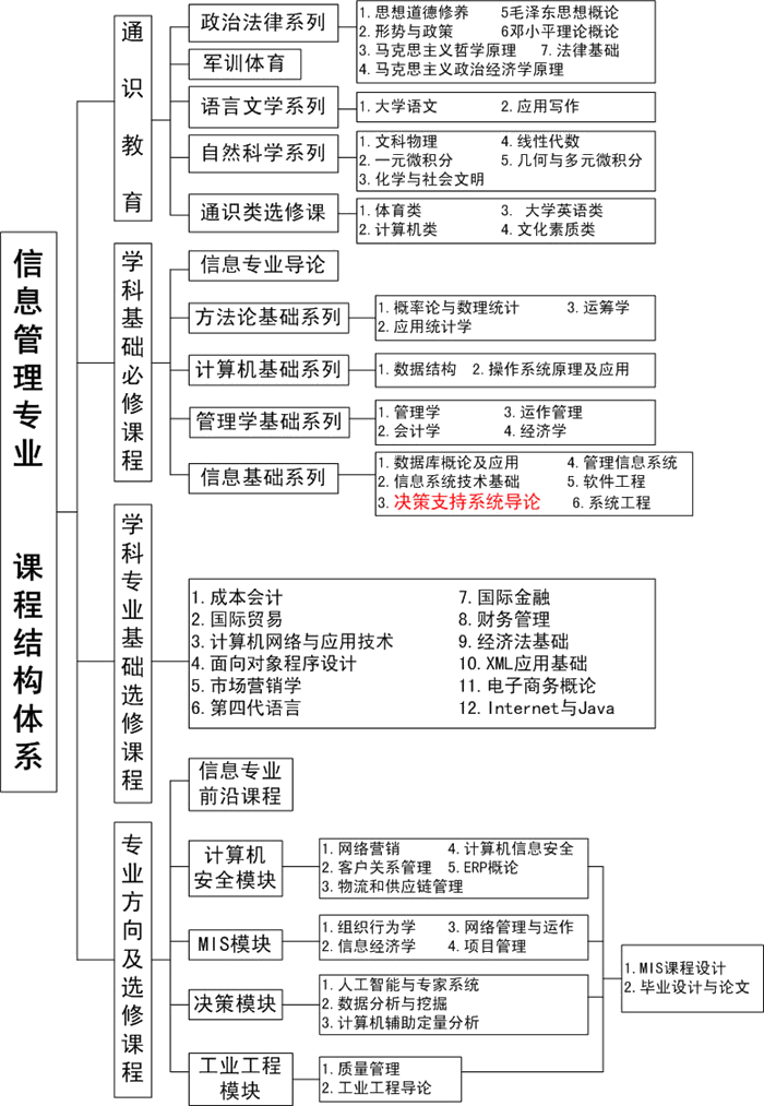 经济学、运作管理、会计学、成本会计、财务管理、国际贸易、国际金融、市场营销学、经济法、信息技术基础、计算机网络与应用技术、面向对象的程序设计、INTERNET 与 JAVA、XML技术、数据库系统及应用、软件工程、操作系统、数据结构、管理信息系统、决策支持系统导论、电子商务导论、工业工程导论、ERP概论、客户关系管理、物流与供应链管理、网络营销、质量管理、应用统计学、运筹学、