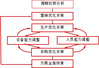 现代企业的决策一般过程为:周期形势分析、营销优化决策、生产优化决策、营销决策调整、采购优化决策、方案全面预算和决策方案调整,如