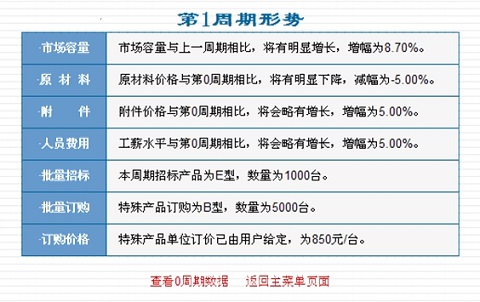 决策仿真实验通常可连续进行5~7个经营周期,每个周期都会给出一份周期市场经济形势报告,周期市场经济形势报告涵盖了产品市场需求容量、原材料价格、附件价格、人员费用、一般产品招标数量、特殊产品订购批量及其订购价格等的变化变动情况,这些都将会成为影响现代企业经营决策及其成果的重要因素。