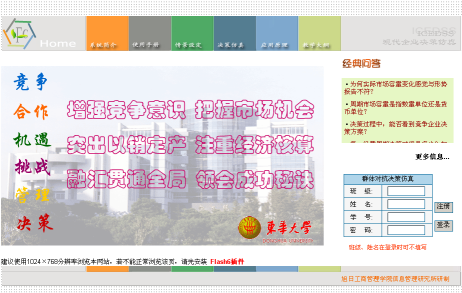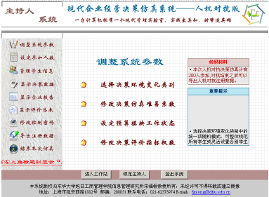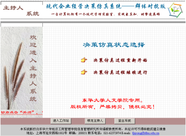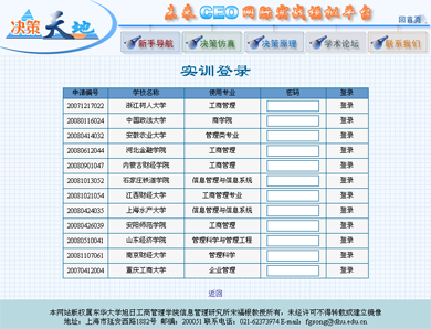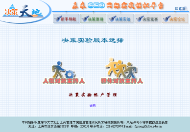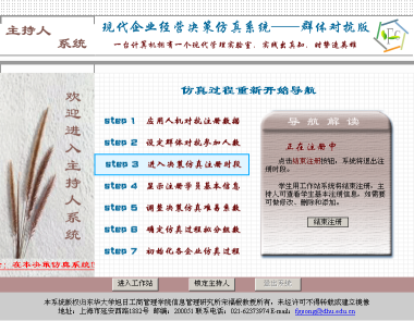 学生在学习了现代管理决策基本课程后,即可进入"决策天地"学习社区的"实训服务"模块,在教师组织下分别应用"决策仿真——人机对抗版"和"决策仿真——群体对抗版"开展竞争条件下的现代管理决策实践。实验时,可先应用"人机对抗版",这是因为"人机对抗版"在使用时,是学生个人和计算机之间展开竞争,不受所有学生决策方案必须同时比较计算的约束,学生个人可在规定的时间范围内自行掌握实验进度,并可反复重新开始新的决策轮次过程,以先期取得一定的经验和体会。尔后,再应用"群体对抗版"或"交叉对抗版",学生相互之间或同时与计算机之间展开竞争,循序渐进,即能取得更好的实验效果。