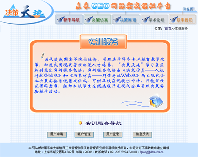 开始决策实验时,教师(主持人)应先行登录"决策天地"网站首页,点击"实训服务"后即可进入实训服务页面,查看"服务导航",了解决策实验应用原理;进行"帐户管理",维护教师学生信息密码;实施"用户登录",启动决策实验运行过程。实训服务界面如图1所示。