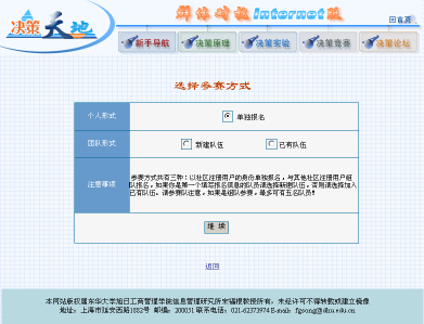 步骤三:选择大赛参加方式。填写完成报名信息后,若点击"继续"按钮,则可选择决策仿真大赛是以"单独报名"方式参加,还是以"组队报名"方式参加。若是点击了"单独报名"按钮,即是指以个人形式报名参赛,一人构成一个参赛队,队名即为社区注册时的用户名,密码为注册时所键入的密码,再点击"继续"按钮后,循序结束报名。方式的选择如图 3 所示。