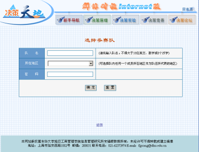 名。在进入学习社区的首页并登录后,直接点击"群体对抗—Internet版"按钮即可进入至群体对抗系统首页,在该首页的右下角键入用户名和对应密码,再点击"报名"按钮,系统显示出参加决策仿真大赛报名表,可按表中各栏目提示,循序填写完成报名内容,如图 2 所示。