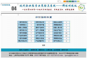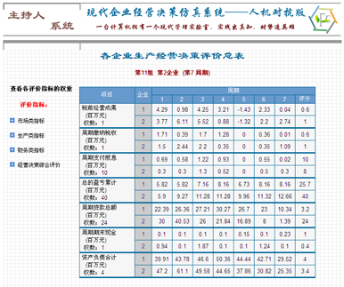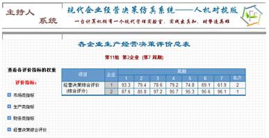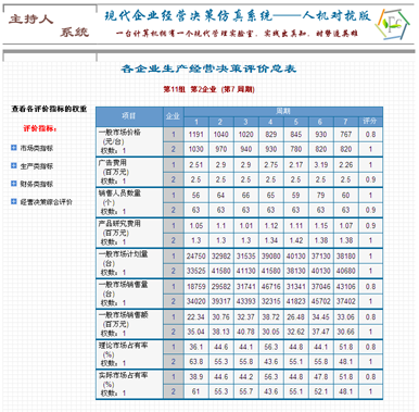 无论何种版本,周期竞争计算结束后,点击工作站系统主菜单界面椭圆环中的编号6按钮(预算时也可以是企业报告主菜单中的"生产经营评价总表"按钮),即可查看本周期一定决策方案下的企业经营成果评价总表数据。评价指标共含有三大类:市场类、生产类和财务类,配以各项指标权数,以相对比较法计算出各指标小计分,最后再累加成企业评价总分,供各企业从总体上评价所作方案优劣分析用。