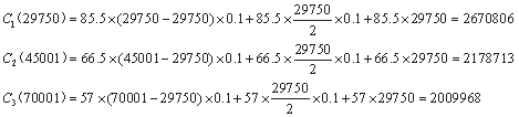由于2009968数值最小,所以,可确定对应的原材料采购批量即为70001个单位。同理,生产上附件需要量为24750单位,对应于不同采购批量的附件购买单价为: