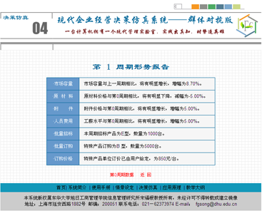 开展一个经营周期的决策仿真过程,首先须查看周期形势变化,把握市场形势机会。点击椭圆环中的编号1, 系统将逐一显示相应周期的市场周期形势变化,如第一周期的形势变化图2所示: